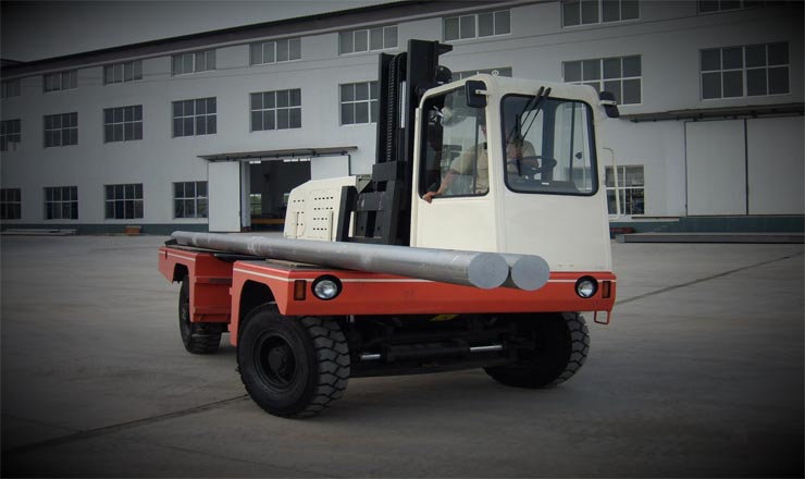 由于側(cè)面叉車的門架和貨叉位于車體一側(cè)。側(cè)面叉車進(jìn)入貨架通道后,貨叉就是正面對貨架或貨垛,裝卸、堆垛作業(yè),叉車不用轉(zhuǎn)彎,可以直接進(jìn)行裝卸、堆垛作業(yè)。