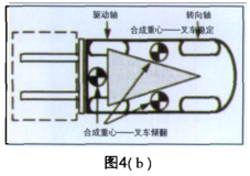 (c)動(dòng)態(tài)穩(wěn)定性。以上的穩(wěn)定性討論沒有考慮車輛和貨物移動(dòng)對(duì)叉車所產(chǎn)生的動(dòng)態(tài)影響。重量轉(zhuǎn)移和合成重心變化取決于叉車運(yùn)行、制動(dòng)、轉(zhuǎn)彎、起升、傾斜和下落貨物等情況時(shí)產(chǎn)生的動(dòng)態(tài)力,這些是影響穩(wěn)定性的重要因素。