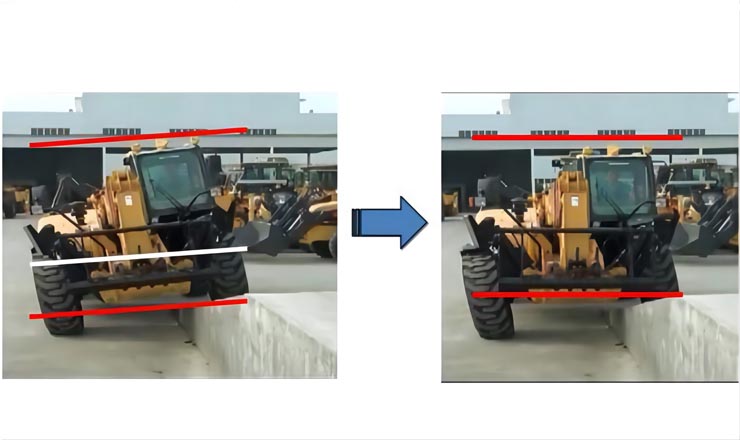 特有的車架調平系統(tǒng),保證整機在不平整地面工作時,通過控制調平油缸的伸縮,實現(xiàn)車架橫向水平,保證作業(yè)時的安全可靠。